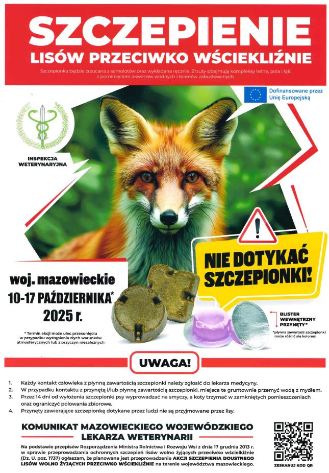 Przypominamy, że w dniach 10-17 października 2025, na terenie województwa mazowieckiego, przeprowadzona zostanie akcja szczepienia lisów wolno żyjących, przeciw wściekliźnie.