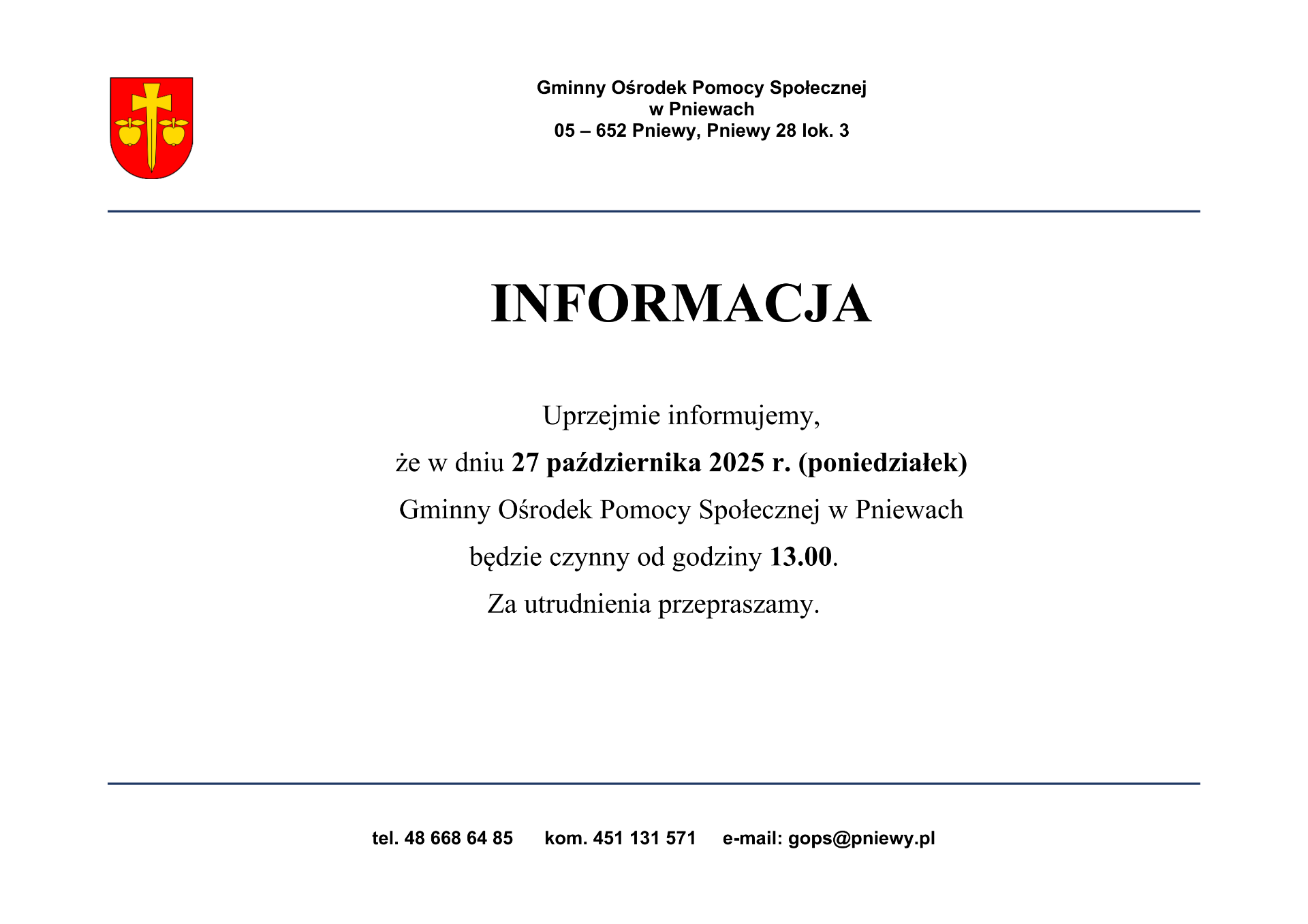 Informacja w sprawie zmiany godzin pracy Gminnego Ośrodka Pomocy Społecznej w Pniewach w dniu 27.10.2025r.