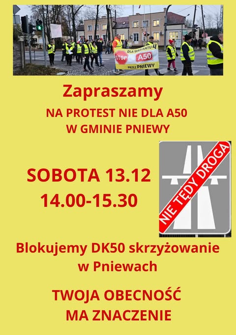 W dniu 13 grudnia br. (sobota) w godzinach 14.00-15.30 na skrzyżowaniu przy Urzędzie Gminy Pniewy odbędzie się protest przeciwko budowie Obwodnicy Aglomeracji Warszawskiej przez teren Gminy Pniewy.