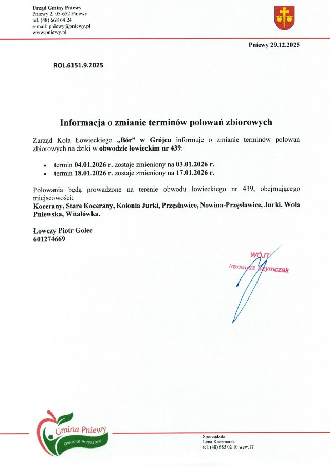 Zmiana terminów polowań koła łowieckiego Bór
