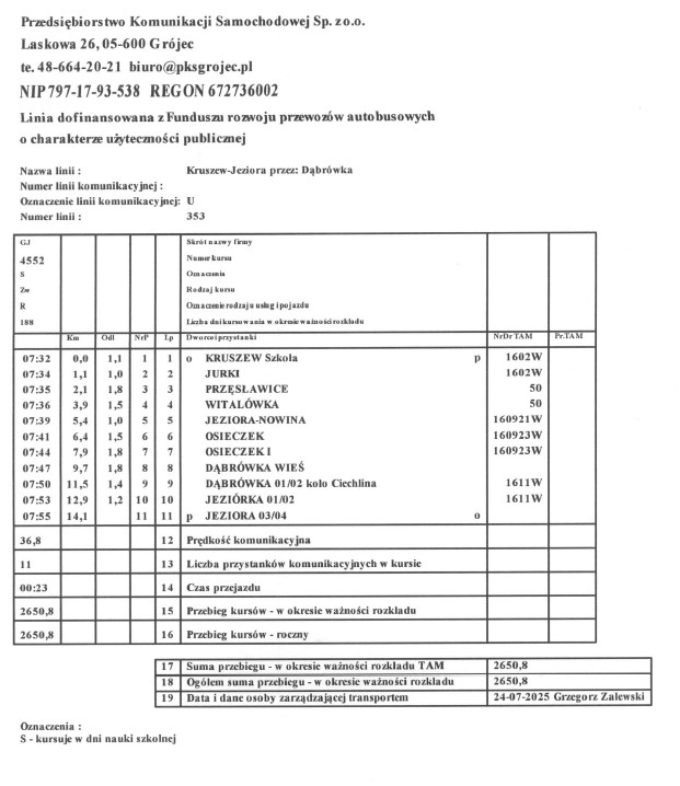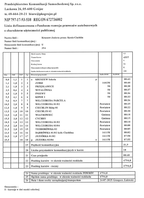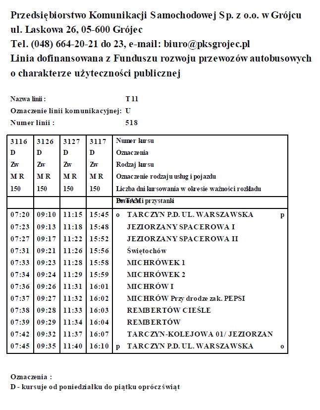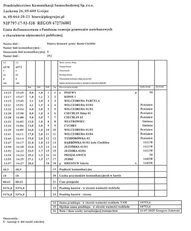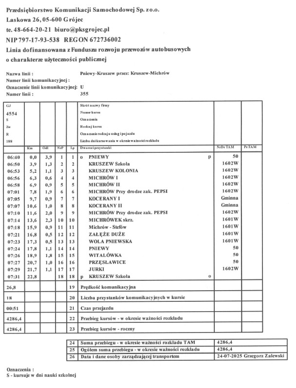 Poniżej przekazujemy Rozkłady linii komunikacyjnych przewozów autobusowych na terenie Gminy Pniewy dofinansowanych ze środków Funduszy rozwoju przewozów autobusowych województwa mazowieckiego, ważne od 01.01.2026 r. do 31.12.2026 r.