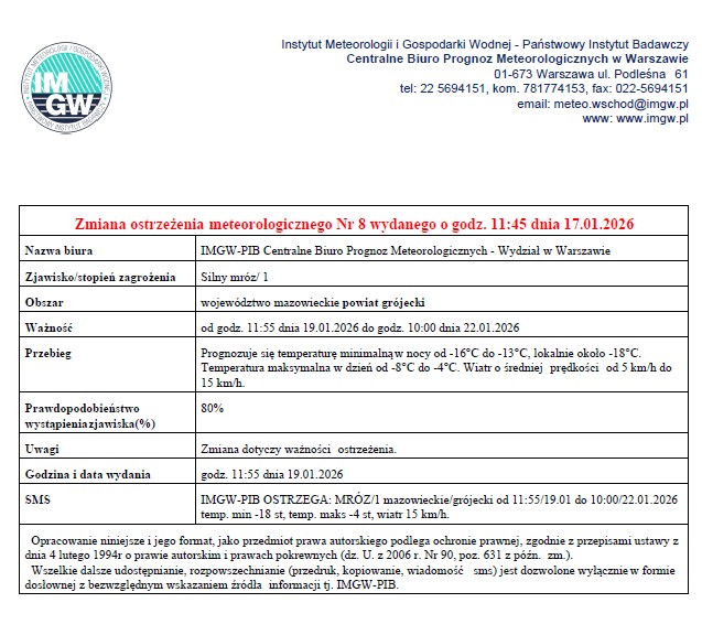 Ostrzeżenie meteorologiczne 19.01.2026