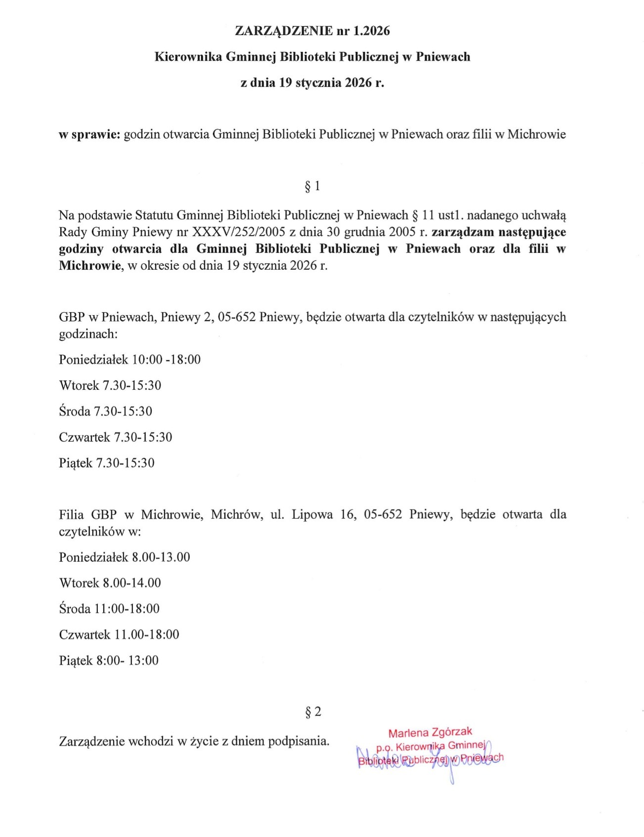 • 02.01.2026 Zarządzenie nr 1.2026 Wójta Gminy Pniewy z dnia 2 stycznia 2026...