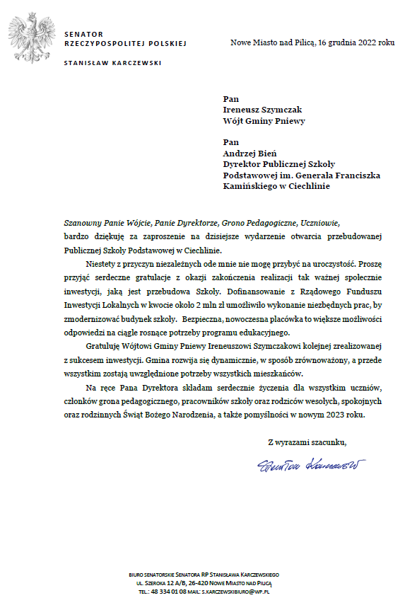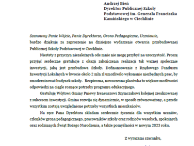 16 grudnia 2022 roku, w świątecznej atmosferze,  odbyło się uroczyste otwarcie rozbudowanej Publicznej Szkoły Podstawowej im. gen. Franciszka Kamińskiego w Ciechlinie.