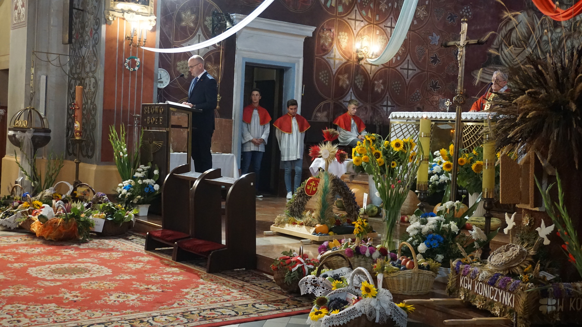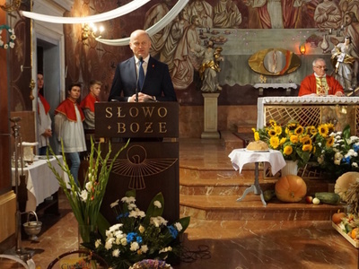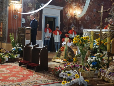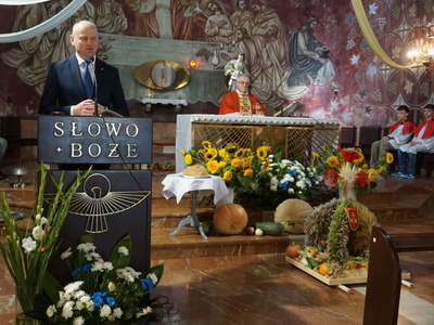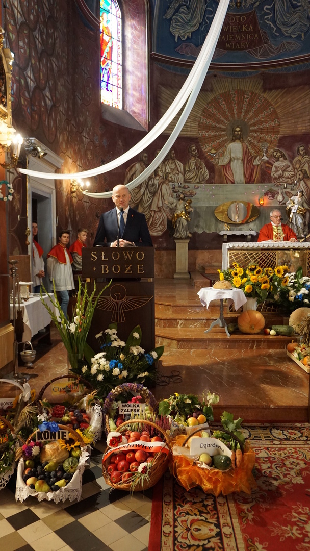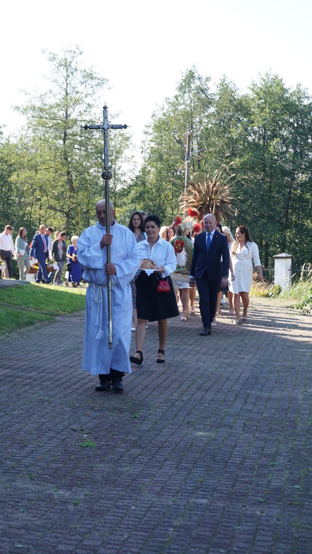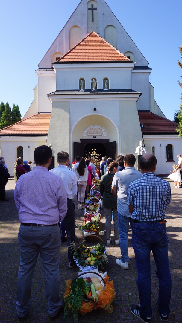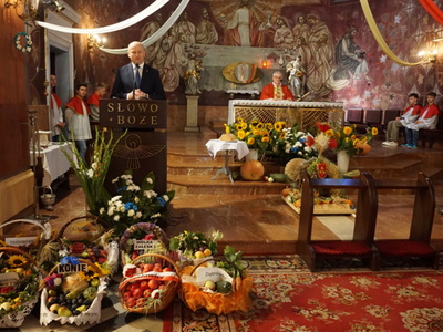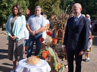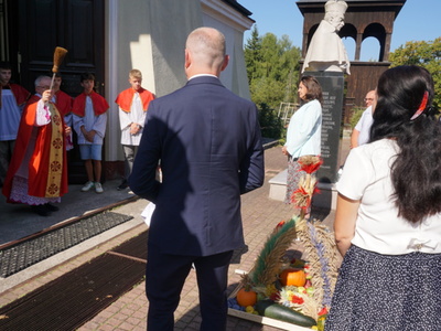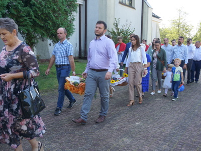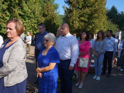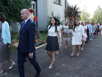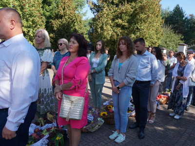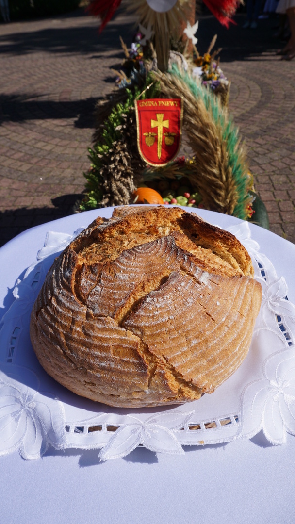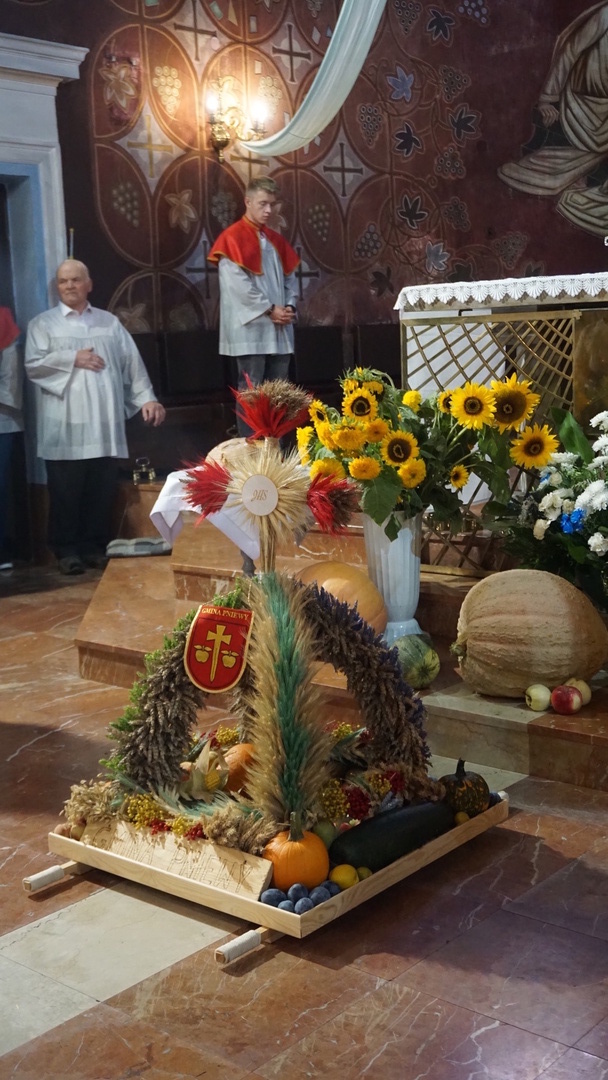 Uroczystą mszę świętą ks. prałat Wojciech Kołakowski rozpoczął od poświęcenia chleba dożynkowego oraz przyniesionych przez parafian darów dożynkowych. W trakcie mszy św. został udzielony głos Wójtowi Gminy Pniewy Ireneuszowi Szymczakowi, który pokrótce przedstawił historię Gminy Pniewy i korzenie, z których wywodzi się obecny herb Gminy Pniewy.  Herb Gminy Pniewy w obecnej formie został uchwalony w 2013 roku przez Radę Gminy Pniewy (Uchwała Nr XXXI/154/13 Rady Gminy Pniewy z dnia 10 maja 2013 r. w sprawie ustanowienia herbu, flagi i pieczęci Gminy Pniewy).