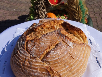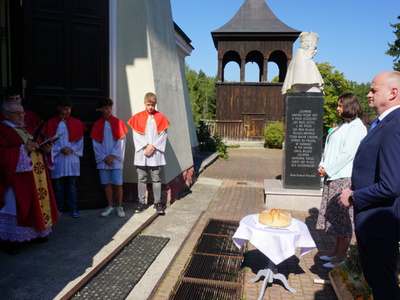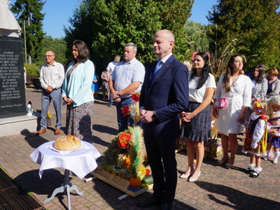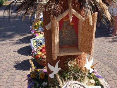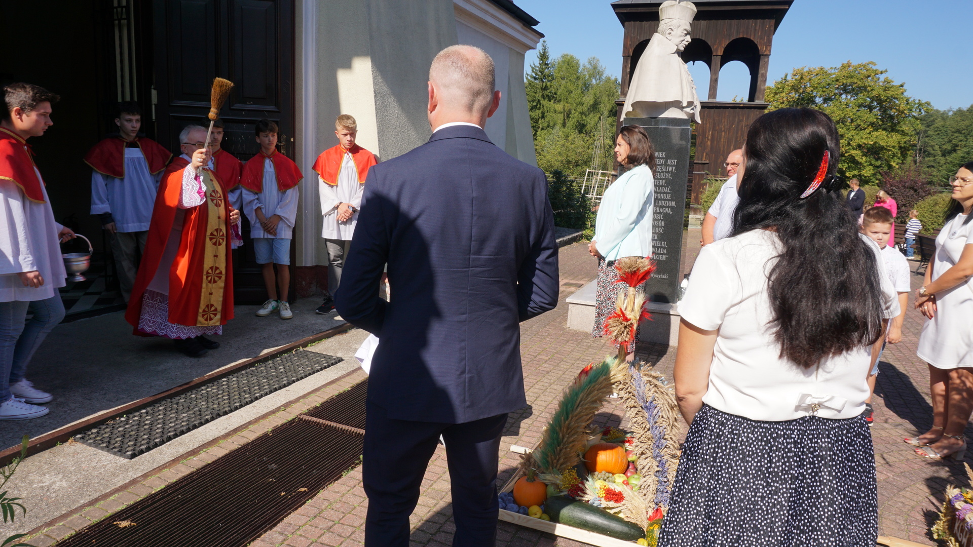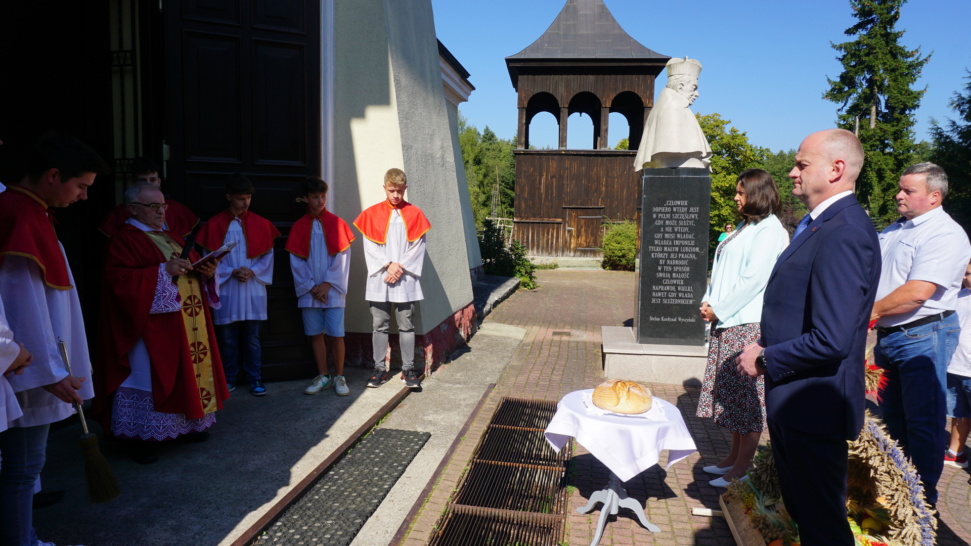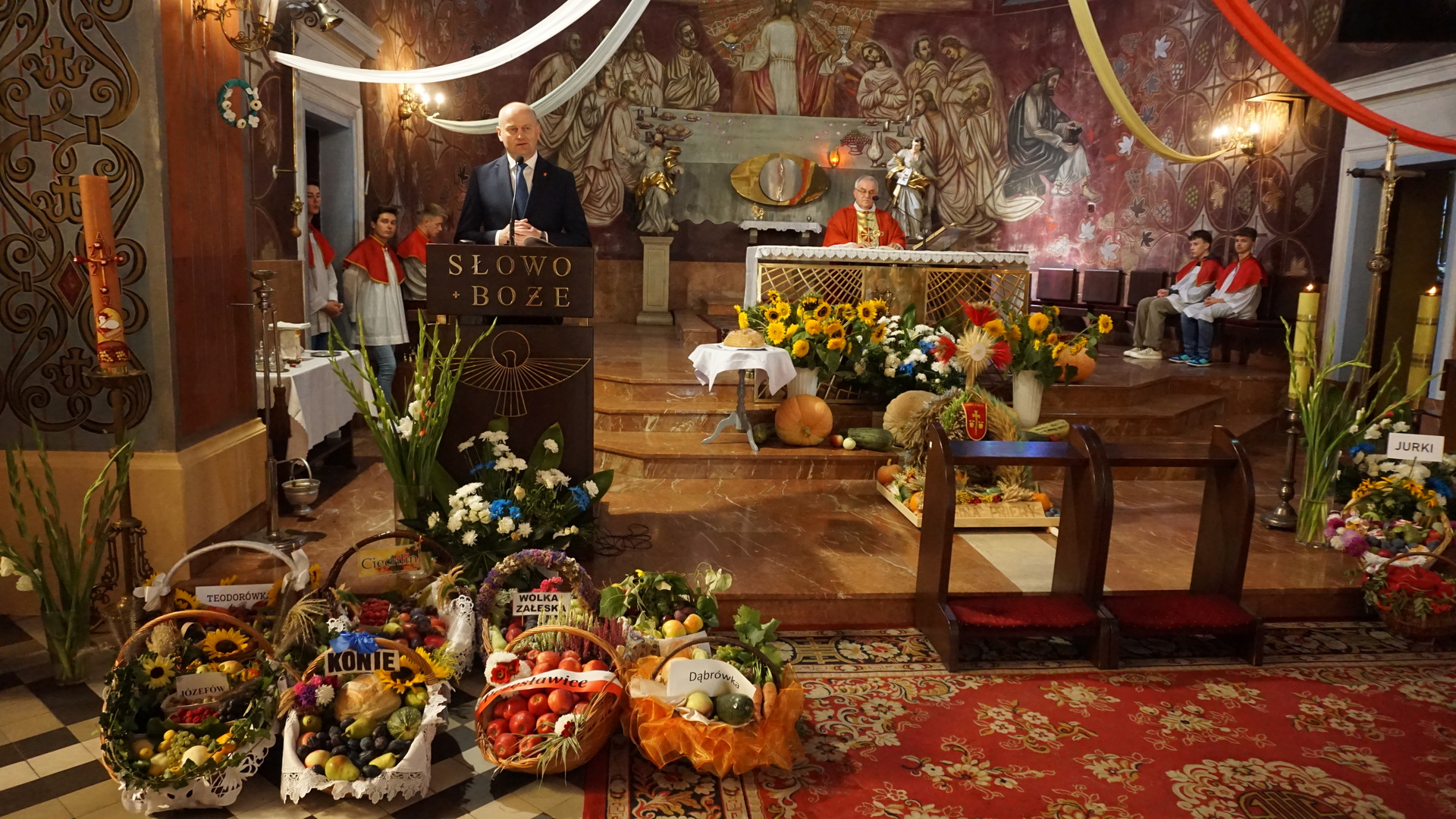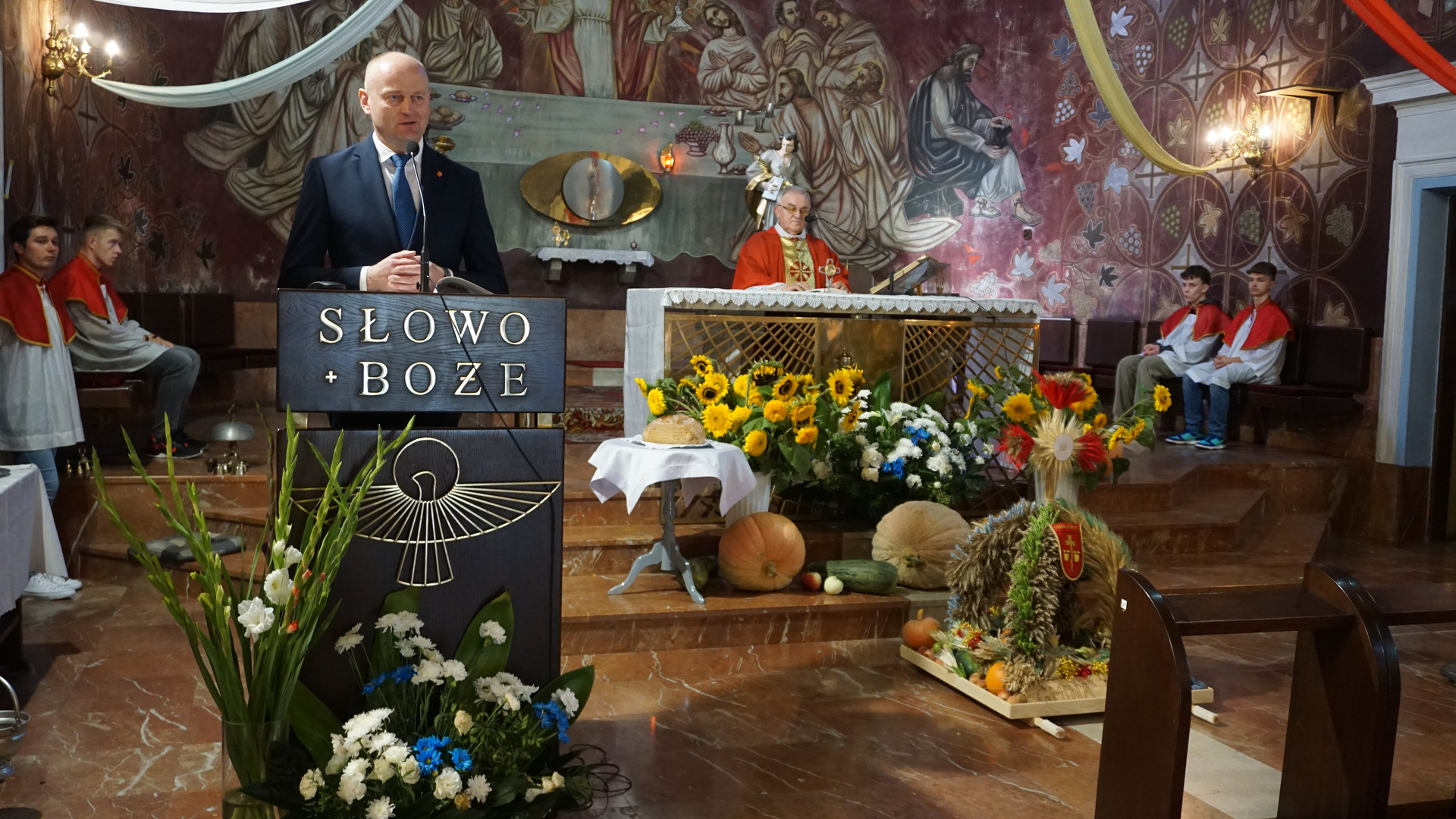Uroczystą mszę świętą ks. prałat Wojciech Kołakowski rozpoczął od poświęcenia chleba dożynkowego oraz przyniesionych przez parafian darów dożynkowych. W trakcie mszy św. został udzielony głos Wójtowi Gminy Pniewy Ireneuszowi Szymczakowi, który pokrótce przedstawił historię Gminy Pniewy i korzenie, z których wywodzi się obecny herb Gminy Pniewy.  Herb Gminy Pniewy w obecnej formie został uchwalony w 2013 roku przez Radę Gminy Pniewy (Uchwała Nr XXXI/154/13 Rady Gminy Pniewy z dnia 10 maja 2013 r. w sprawie ustanowienia herbu, flagi i pieczęci Gminy Pniewy).