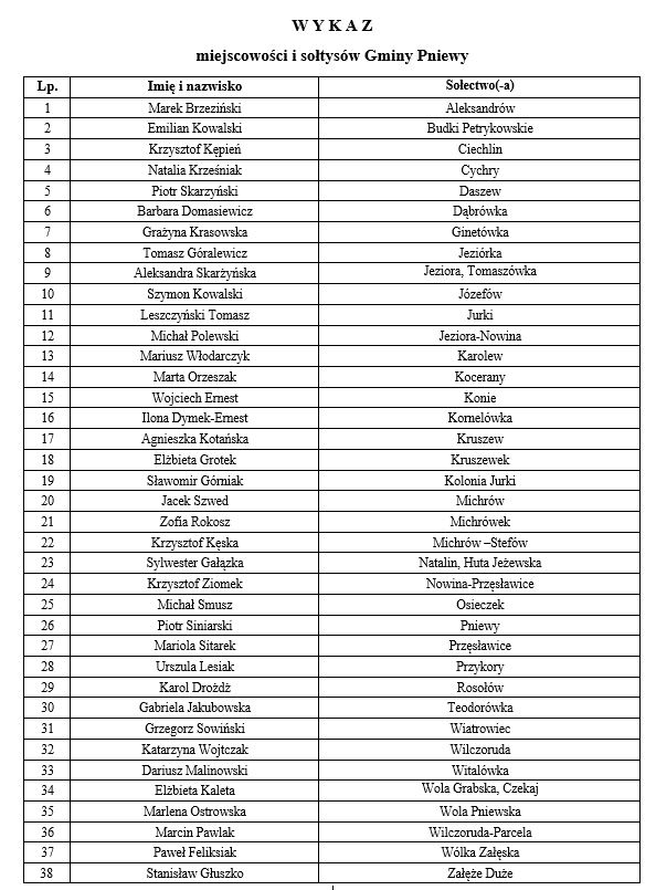 W załączeniu zamieszczamy aktualny wykaz Sołtysów w poszczególnych sołectwach Gminy Pniewy.